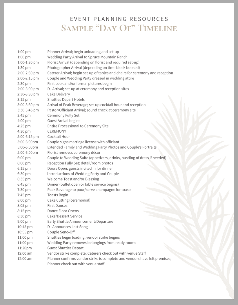 Here is an example timeline for a full-day wedding package at Spruce Mountain Ranch: